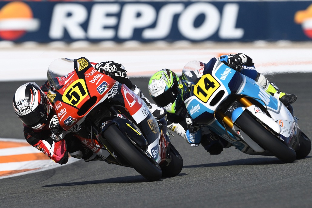 موتورسواران در حال رقابت در رده Moto2 مسابقات FIM CEV Repsol تحت نظارت FIM Europe.