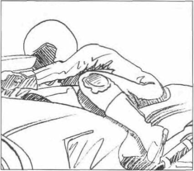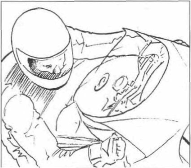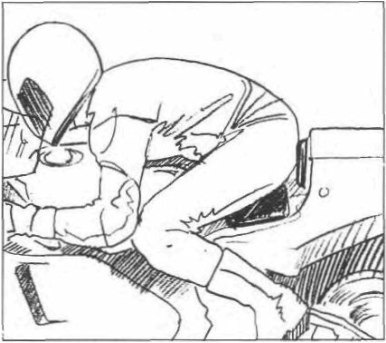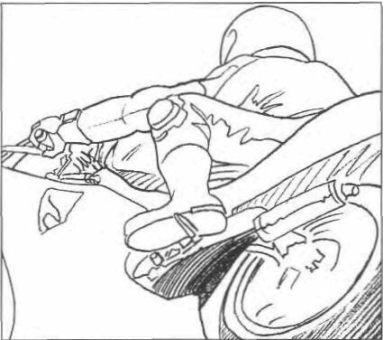 Trying to anchor* yourself firmly on the bike requires a place to hold on. Unfortunately, the inside bar is the handiest thing to hold on to. The problem created is that the bike will go to the outside of the turn because you are counter-steering (pulling on the inside bar) toward the outside of the turn. Holding onto the bike with one leg or both legs eliminates this often baffling problem. Resting the elbow on the tank can help and having the seat section short enough to use as a pivot point for the body can also be a workable solution.