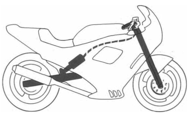 سیستم تعلیق (Suspension): سامانهای شامل فنرها و کمکفنرها که از انتقال ضربات ناشی از چرخها به بدنهٔ موتورسیکلت جلوگیری میکند.