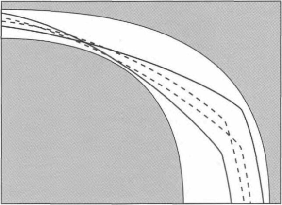 Each time you back off the throttle or slow your basic throttle roll-on through a turn, it costs time and stability. Your approach to the turn determines whether this happens or not. Decreasing radius (DR) turns are the classic example (see diagram). Taking a standard approach to the first radius always forces you to back off the gas in mid-turn. That’s not an ideal line because it immediately violates the throttle rule.