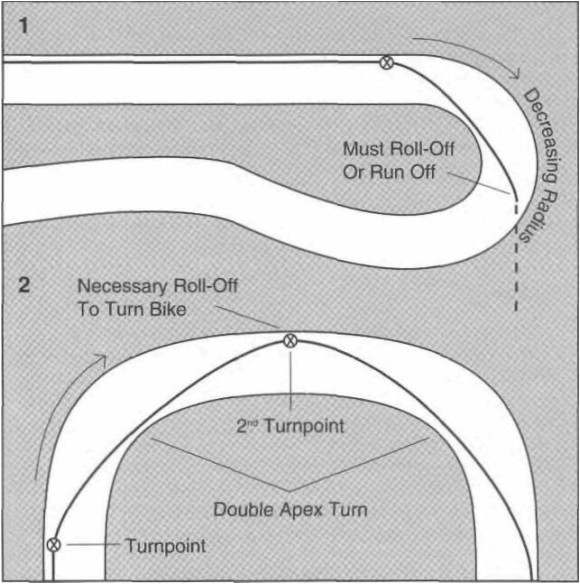 Let’s not confuse a double-apex turn with a DR. In a double-apex turn (see diagram) you may well roll off the gas to get the bike turned between the two parts of the corner. This allows you to fully and correctly control the throttle on the exit of the second part of the corner and not be “stuck” with holding the gas steady. In fact, “stuck on the gas” is one of the primary indicators that you have a “bad line.” Of course! It violates the throttle rule.