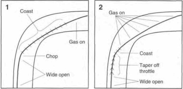 پیچ تند «کینک» در پیست رود آمریکا، چرخش بزرگ «کاروسل» در سیرز پوینت، پیچ شمارهی نه در لاگونا، پیچ بلند درونمیدانی دیتونا و پیچ شمارهی دو در ویلو از نمونههای موفق همین روشاند. در بسیاری از موارد، سوار درمییابد که هرگز نیازی به بستن کامل گاز نداشته است، یا اگر هم گاز را بسته، تنها برای لحظهای کوتاه بوده—به اندازهای که فقط موقعیت «بسته» را احساس کند. در این حالت، استفاده از ترمز به خاطرهای دور تبدیل میشود. یکی دیگر از واکنشهای غریزی بقا با درک درستِ کنترل گاز و اصول پایهی رفتار موتور از میان میرود.